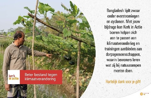 Bangladesh lijdt zwaar onder klimaatverandering. Het land kampt steeds vaker met cyclonen en overstromingen, regen valt onregelmatiger en de stijgende zeespiegel zorgt voor verzilting van landbouwgrond. Boeren hebben grote moeite om te overleven. Kerk in Actie helpt boerengezinnen om zich aan te passen aan klimaatverandering zodat ze hun oogst en inkomen veilig kunnen stellen. Zo leren zij bijvoorbeeld om gewassen op een bamboe geraamte boven de grond te verbouwen, zodat ze bij overstromingen niet wegrotten. Ook leren dorpsgemeenschappen met waarschuwingssystemen en evacuatieplannen voorbereid te zijn op rampen. Via het programma Werelddiaconaat steunt Kerk in Actie de boeren in Bangladesh om bestand te zijn tegen klimaatverandering.